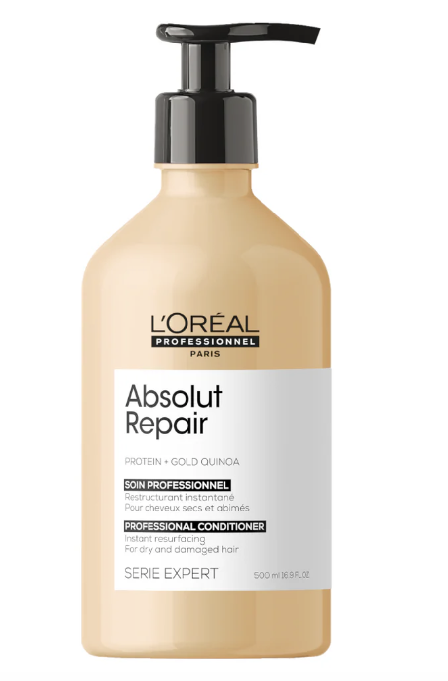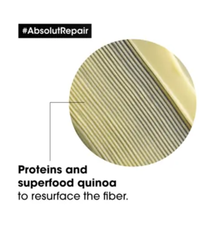 L'Oreal Professionnel Serie Expert Absolut Repair Conditioner. Enriched with Gold Quinoa and Protein, this conditioner repairs and nourishes very damaged hair while leaving it with a lightweight touch and shiny finish.