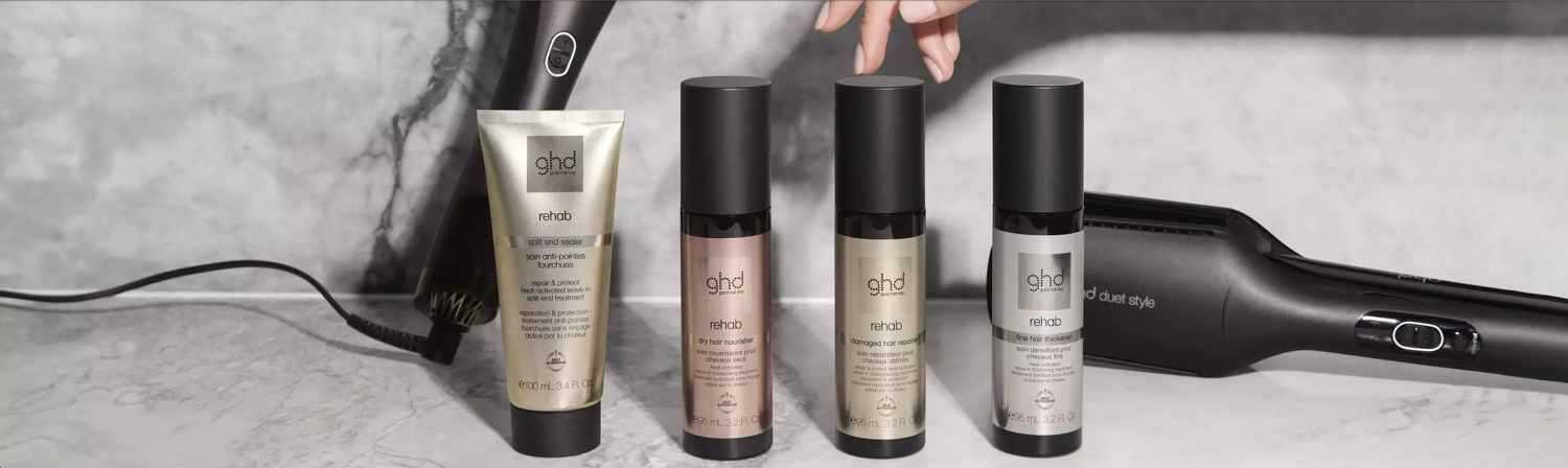 Shake well before use. Depending on hair length and texture, apply 1-2 coin-sized amounts to towel-dried hair, twisting through the mid-lengths and ends. Comb through, dry and then activate by drying and styling with the heat of your ghd tools. ghd rehab split end sealer cream can be used once a week or 2-3 times for a more intense treatment.