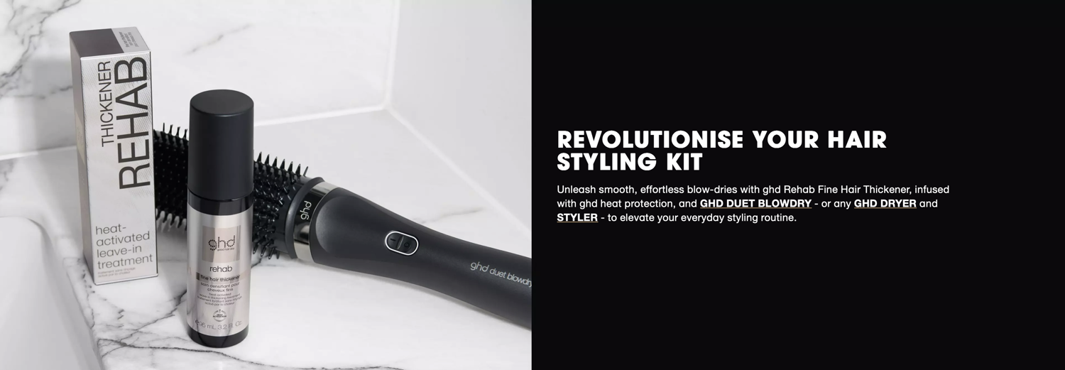 ²Consumer testing, Sep’23. 77% of 97 women agreed ghd rehab makes hair instantly thicker-feeling and 80% agreed it makes hair instantly fuller-feeling, vs before using rehab and heat styling.