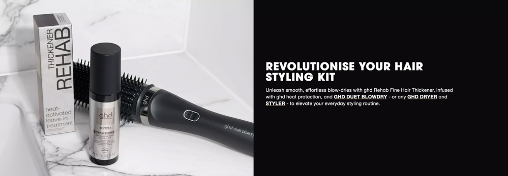 A heat-activated leave-in thickening treatment, ghd Rehab Fine Hair Thickener spray features an advanced, lightweight formula for a strand thickening effect¹ increases the diameter of each strand – delivering instantly thicker and fuller hair² - an instant thickening effect for visibly fuller hair.